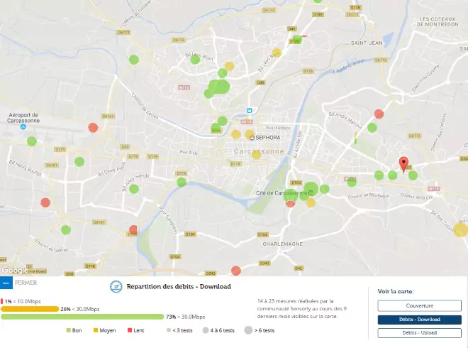 Avec les données de notre partenaire Sensorly, Univers Freebox vous propose un focus sur Carcassonne, 141ème ville de France par sa population et vous fait découvrir la carte de la couverture du réseau 4G et des débits.
