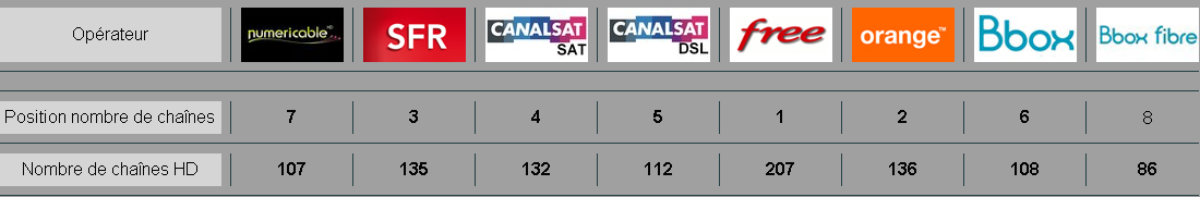 Tous les autres opérateurs se retrouvent loin derrière. Orange, qui lui aussi a intégré une partie des chaînes Canalsat Panorama, compte 136 chaînes en HD et prend la 2ème place. SFR est juste derrière avec 135 chaîne HD. Suivent Canal par Satellite (132 chaînes), et par ADSL (112). Dans la bas du classement on retrouve la BBox, avec 108 chaînes HD, Nuémricable, 107 chaînes HD, et le dernier du classement, la Bbox fibre qui ne propose que 86 chaînes HD