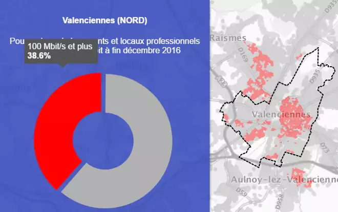 Grâce à la première carte on peut voir que la ville de Valenciennes est couverte à 38.6% par le très haut débit.