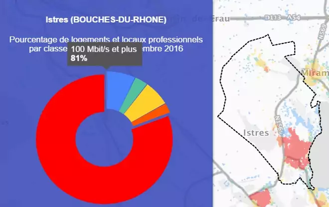 Grâce à la première carte on peut voir que la ville de Istres est couverte à 81% par le très haut débit.