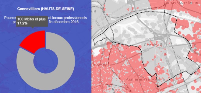Grâce à la première carte on peut voir que la ville de Gennevilliers est couverte à 17.2% par le très haut débit.