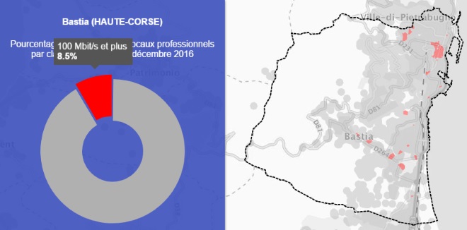 Grâce à la première carte on peut voir que la ville de Bastia est couverte à 50.4% par le très haut débit.