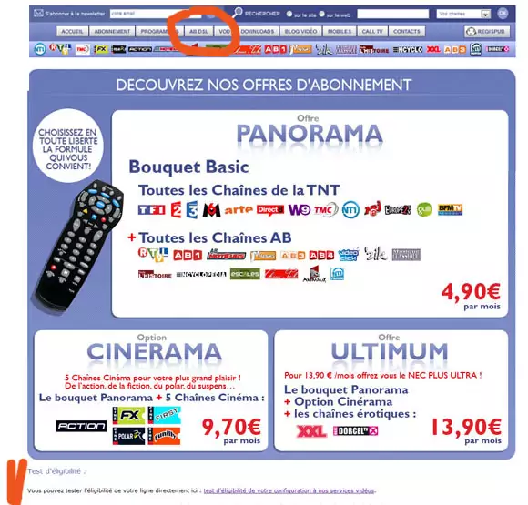 Mais là ou l’information semble s’enflammer pour rien, c’est que cet abonnement est disponible sur la page « AB DSL », autrement dit, une offre de télévision sur internet. Le bas de la page concernée ne laisse aucun doute quant au support de diffusion puisqu’il est proposé de tester sa ligne. Une fois effectué, si ce test n’est pas concluant, il n’est pas possible de souscrire à cette offre.