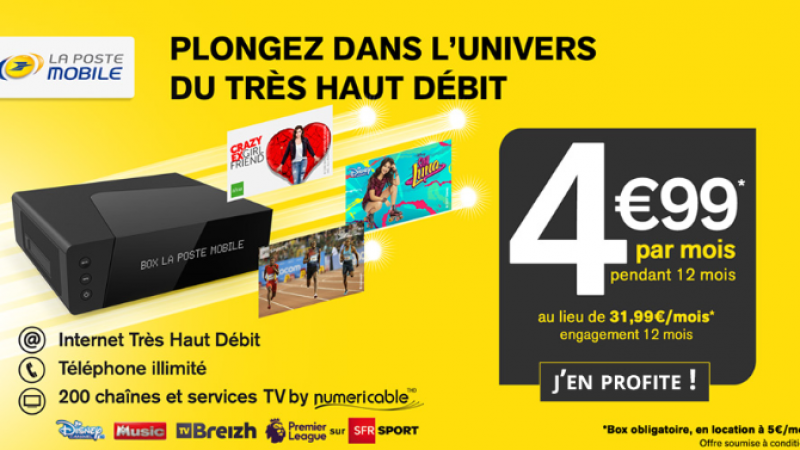 La Poste Mobile vient de lancer une offre sur Showroome Privé qui sera disponible jusqu’au jeudi 29 juin 8h. Une première pour l’opérateur. Celle-ci propose la Box Très Haut Débit TV Plus 4K de La Poste Mobile (qui est en fait la box 4K de SFR) à 9,99€/mois dont 5€/mois de location de box) la 1ère année, puis 36,99€/mois ensuite ( dont 5€/mois de location de box) avec un engagement de 12 mois (le temps de la promotion)