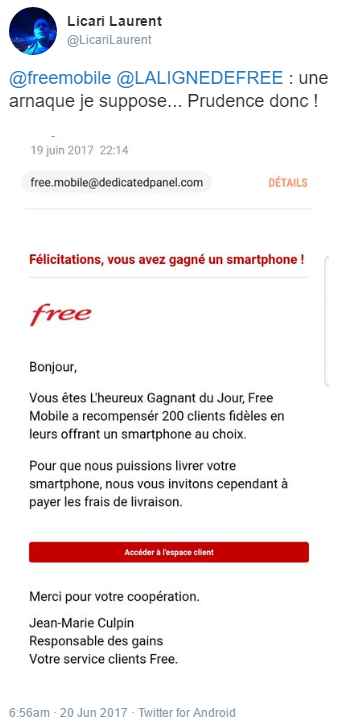 Attention au faux "responsable des gains" de Free qui veut encore vous offrir le smartphone de votre choix. Ce phishing est signé d’un certain Jean-Marie Culpin, qui occuperait un un poste qui n’existe évidemment pas chez l’opérateur et qui devient récurrent pour ce type d’arnaque.