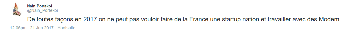 Bonus : Au revoir François Bayrou après 36 jours de bons et loyaux services au gouvernement. Emmanuel Macron veut faire de la France une nation des start-ups et un twittos semble avoir trouvé la vraie raison de la non-reconduction du président du MoDem.