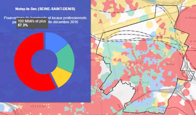 Grâce à la première carte on peut voir que la ville de Noisy-le-Sec est couverte à 57.3% par le très haut débit.