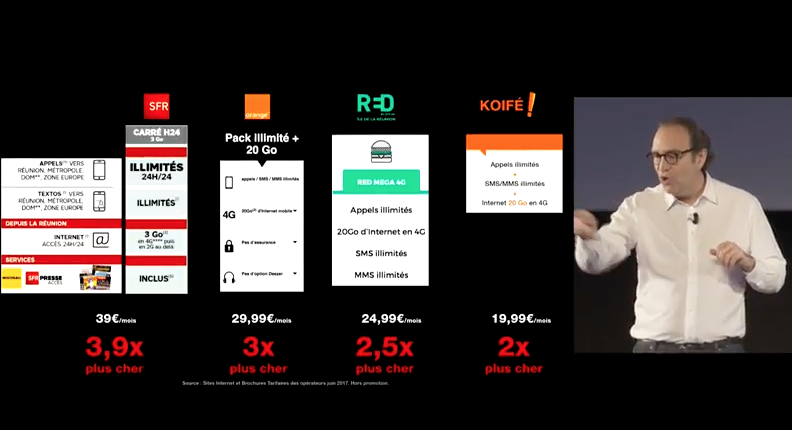 Tambour battant, Free a volé ce matin au secours de beaucoup de Réunionnais en lançant son forfait à 9,99€/mois, comprenant 50 Go de data dont 25 Go en roaming, et ce avec une couverture digne de ce nom, 98% en 4G+. Si comme le précise Xavier Niel, « l’effet Free s’est fait ressentir en amont » puisque des opérateurs ont déjà baissé leur prix ou augmenté leur data, alors l’arrivée de Free a de quoi donner un sérieux coup au moral de la concurrence, un peu comme en 2012 mais à moindre échelle. Le patron de Free a d’ailleurs humorisé la situation sur l’île : « Vous êtes des vaches à lait et il y en a marre». Des propos qui viennent s’ajouter à une déclaration de l’opérateur dans un communiqué : « Depuis toujours les Réunionnais paient les produits de grande consommation beaucoup plus cher qu’en Métropole. Il n’est pas rare que les produits basiques du quotidien soient 2 à 3 fois plus coûteux. Il en est de même pour les forfaits de téléphonie mobile. Alors même que la TVA est plus faible à La Réunion, alors même que les Réunionnais ont un revenu médian très inférieur aux métropolitains. Marre de ces abus ! » Et très clairement, les mots sont suivis d’actes aujourd’hui puisque ce forfait Free Mobile vient totalement enrayer la machine du côté des autres opérateurs, l’en atteste cette comparaison des prix présentée ce matin lors de la conférence de lancement.