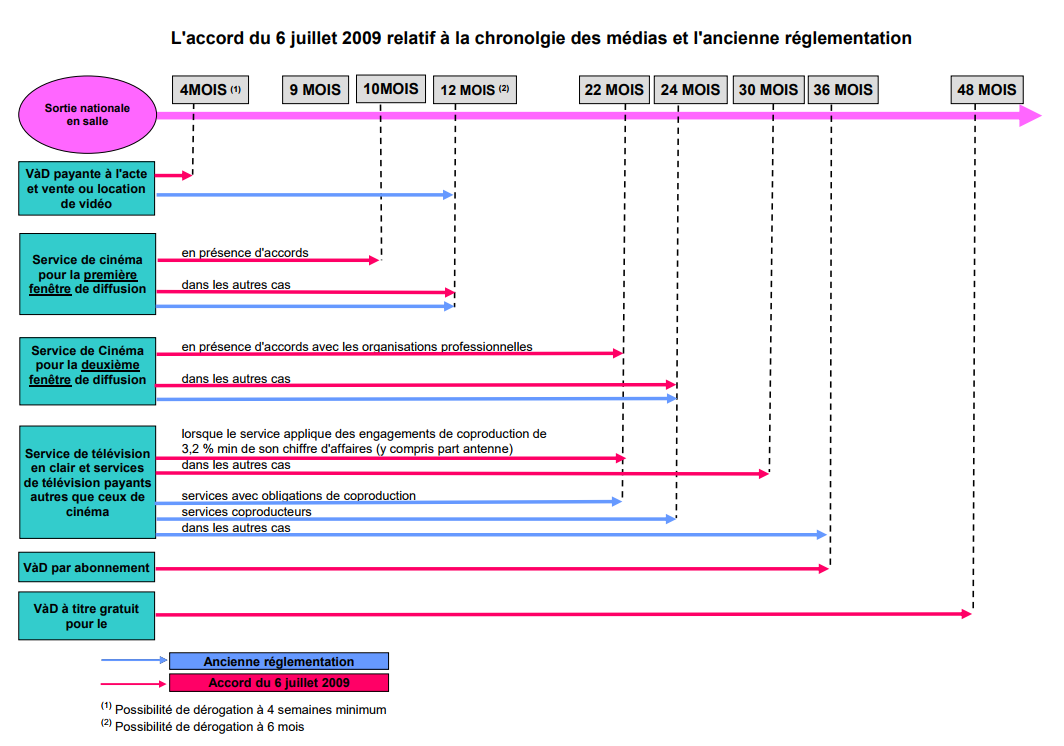 La chronologie des médias impose un délai qui doit être respecté entre la sortie en salle d’un film en France et la première diffusion à la télévision.Ce délai à compter de la date de sortie nationale en salle est de 10 mois pour les services de cinéma de premières diffusions qui ont conclu un accord avec les organisations professionnelles du cinéma.