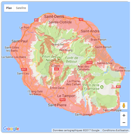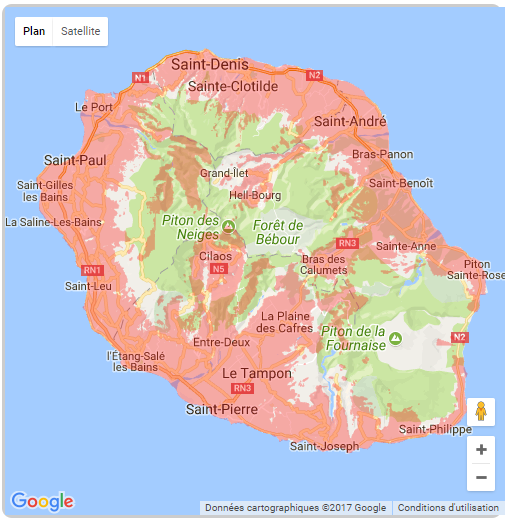 Free vient de publier sa carte de couverture mobile officielle pour l’île de La Réunion, pour la 4G mais également la 3G et la 2G. Free précise que les zones de couverture en extérieur sont calculées par ordinateur et ont une valeur indicative. Les données datent de juillet 2017.