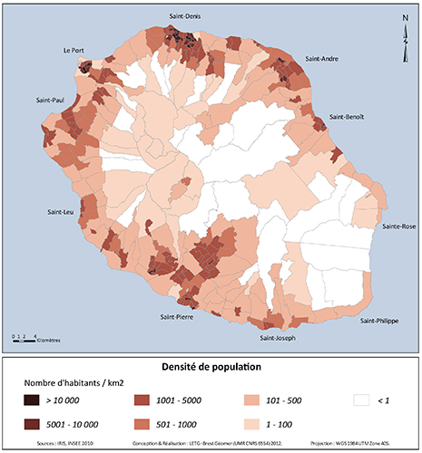 En application de sa licence, la disponibilité du Service de Free Mobile correspond à un taux de disponibilité, à l’extérieur des bâtiments, d’au moins 95% dans la zone de couverture. Pour comparaison suivent les cartes de couvertures précédées d’une carte représentant la densité de population sur l’île.