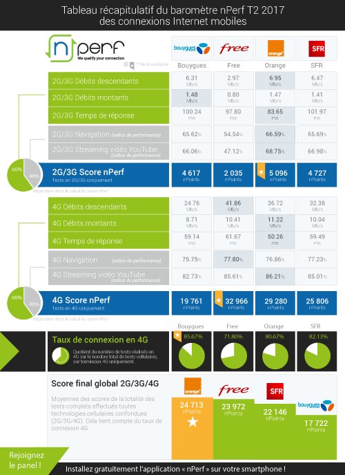L’application mobile nPerf, développée par DegroupTest, permet d’évaluer la qualité de sa connexion mobile 2G/3G/4G/Wi-Fi en effectuant un test de débit, un test de navigation et un test de streaming vidéo. Les données récoltées durant le deuxième trimestre 2017 (362 933 tests) ont permis de constituer un baromètre afin de créer une photographie de la qualité des connexions mobiles en France métropolitaine.