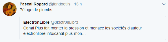 Canal plus continue en affirmant qu’ils paieront “les ayants droits sur la base des oeuvres de leur répertoire qu’il diffuse”. Et conclut son argumentaire émettant des doutes sur le fonctionnement des sociétés de gestion collective, notamment sur la possibilité que les auteurs et créateurs ne récupéreraient pas “l’intégralité des sommes qui leur sont dues”. Ces sociétés de gestion étant sous la tutelle du ministère de la Culture, le groupe en soulevant l’idée de réaliser des audits “précis et exhaustifs sur ces organismes de collecte” tente de déplacer la responsabilité du conflit sur les sociétés de gestion. Une forme de menace à peine voilée qui passe mal, coté société de gestion, le directeur de la Société des Auteurs et Compositeurs Dramatiques (SACD) Pascal Rogard a été expéditif sur Twitter en qualifiant cette réaction de “pétage de plombs”.