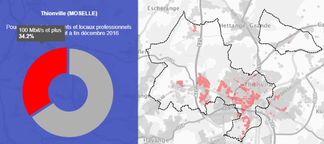 Grâce à la première carte on peut voir que la ville de Thionville est couverte à 37% par le très haut débit.