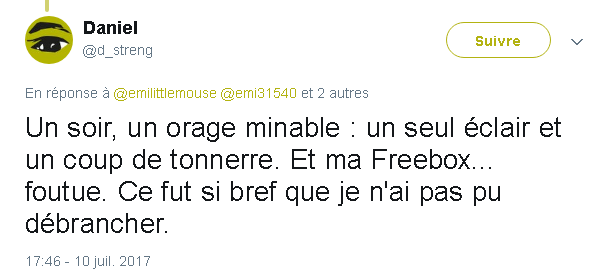 On vous le répète régulièrement sur Univers Freebox, lorsqu’un orage est annoncé, il est fortement conseillé de débrancher votre Freebox en attendant que celui-ci passe. Et il vaut mieux prendre les devants car les choses peuvent aller vite. En effet, hier soir de nombreux départements étaient en alerte orange, et certains Freenautes en ont fait les frais aussi vite que l’éclair, comme le rapporte Daniel sur Twitter.