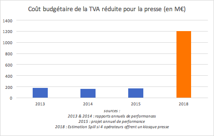 Plus grave, cette manipulation pourrait conduire à une multiplication par 6 du coût budgétaire de la TVA à taux super-réduit sur la presse. Le SPIIL a réalisé une projection sur 2018 en imaginant que les 4 opérateurs s’étaient dotés d’un kiosque. Le coût annuel dépasserait le milliard comme nous pouvons le constater sur ce graphique.