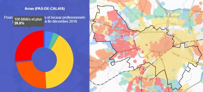 Grâce à la première carte on peut voir que la ville de Arras est couverte à 50.8% par le très haut débit.