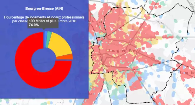 Grâce à la première carte on peut voir que la ville de Bourg-en-Bresse est couverte à 78.3% par le très haut débit.