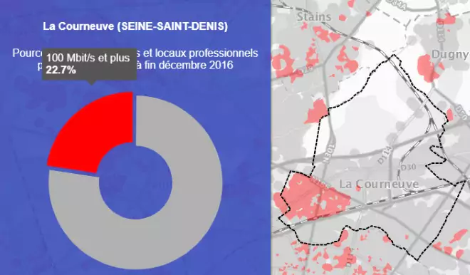 Grâce à la première carte on peut voir que la ville de La Courneuve est couverte à 96.8% par le très haut débit.