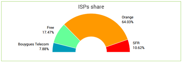 On constate qu’Orange a une position clairement dominante sur le marché FTTH avec 64,03% des tests effectués par ses clients (contre 71,65% le trimestre précédent). Il perd donc un peu de terrain par rapport au trimestre précédent. Viennent ensuite, très loin derrière, Free, qui est en hausse avec 17,47% (contre 13,20% le trimestre précédent). SFR suit à 10,62% (contre 9,28% le trimestre précédent), en hausse également. Et enfin Bouygues Télécom en hause de 2 points mais avec seulement 7,88 % des tests effectués.