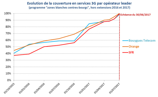 Ainsi, au 30 juin 2017, au vu des déclarations des opérateurs, ce sont plus de 3500 communes et centres-bourgs qui ont pu bénéficier d’une couverture 3G des quatre opérateurs dans le cadre du programme " zones blanches centres-bourgs ".