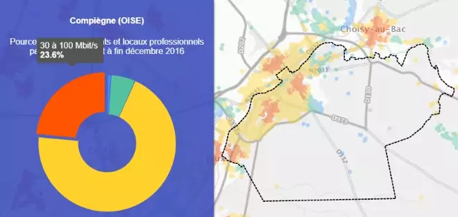 Grâce à la première carte on peut voir que la ville de Compiègne est couverte à 23.6% par le très haut débit.