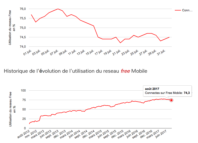 Comme chaque année, les départs en vacances influent directement sur le taux d’utilisation du réseau propre de Free, les abonnés ont la bougeotte et cela s’est réellement ressenti durant l’été 2016 avec une diminution constatée du temps passé sur le réseau Free de 2,7pts entre juin et août (de 70,4% à 67,7%). Cette fois, l’hémorragie est un peu moins significative, en effet le taux d’utilisation entre juin 2017 et août 2017 affiche un recul de 1,8 pts, (de 76,3% à 74,5%), du même acabit qu’en 2015 (-1,6pts sur la même période). A noter qu’au cours du mois d’août, ces pourcentages retrouvent progressivement leur niveau initial et ce généralement sans rechute.