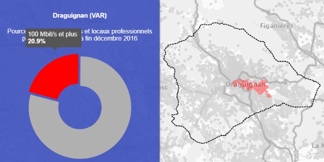 Grâce à la première carte on peut voir que la ville de Draguignan est couverte à 36% par le très haut débit.