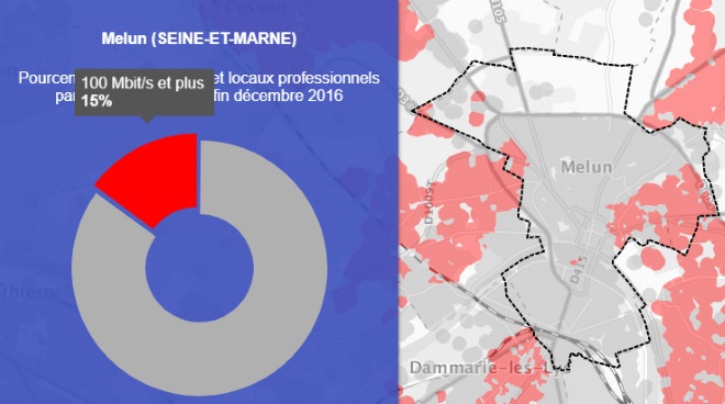 Grâce à la première carte on peut voir que la ville de Melun est couverte à 65.4% par le très haut débit.