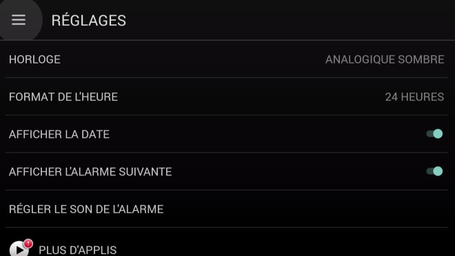 La section « Réglages » permet de modifier l’affichage de l’horloge à savoir : Analogique claire ou sombre ou encore numérique claire ou sombre. De plus, l’utilisateur a la possibilité de paramétrer d’autres éléments comme le format de l’heure ou le son de l’alarme.
