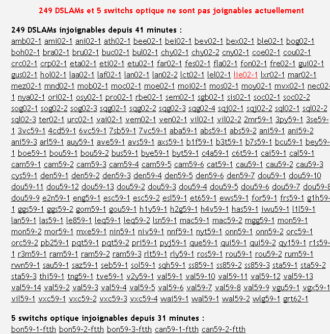 Mise à jour 23h50 : le problème dans le nord de la France est maintenant terminé (sauf sur 3 DSLAM), les abonnés concernés ont de nouveau tous leurs services fonctionnels.