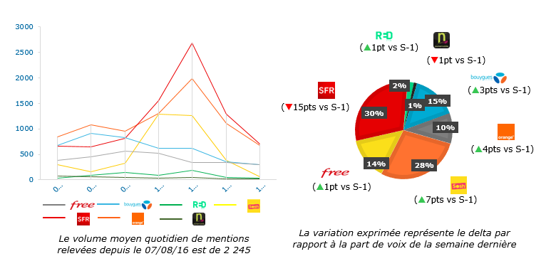 Netino (Webhelp) et Synthesio viennent de publier leur étude hebdomadaire sur la perception sociale des principaux opérateurs télécoms sur le marché français pour la semaine du 7 au 13 août2017. Cette étude se base sur la collecte automatique des données sur un corpus de plus de 600 000 000 sites, blogs, forums, profils Facebook et Twitter.