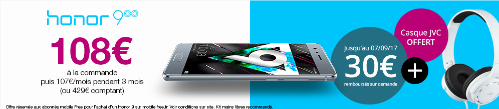 Toujours chez le même fabricant, pour tout achat d’un Honor 9 avant le 7 septembre, un casque JVC HA SR 525 est offert. Et ce, en plus d’une offre de remboursement de 30 euros actuellement en cours (jusqu’au 30 septembre) pour ce modèle.