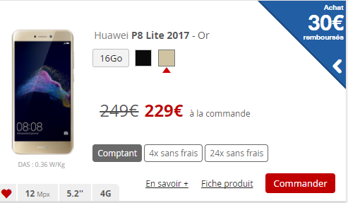 Coup double pour le Huawei P8 Lite 2017 dont le prix comptant passe temporairement de 249 à 229 euros. Une baisse venant s’ajouter à une offre de remboursement de 30 euros en cours, valable jusqu’au 30 septembre prochain.