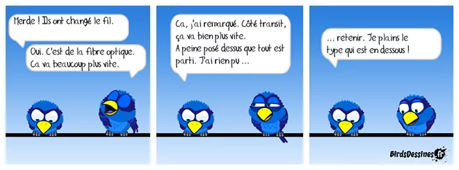 «La fibre en 56k», quand Le Gorafi met les pieds dans le plat ! Numericable en prend pour son grade, Free aussi : Extrait : « Nous avons bridé toutes les connexions pour donner cette sensation de lenteur, de téléchargements qui n’en finissent pas », raconte Justin Longueux, responsable vente auprès de Numericable. A ce recul technologique , Free affirme qu’il s’agit là d’un plagiat de son propre réseau de fibre internet. « Notre technologie de fibre lente a été clairement copiée, nous allons porter plainte dès que notre réseau sera de retour ». Rires.