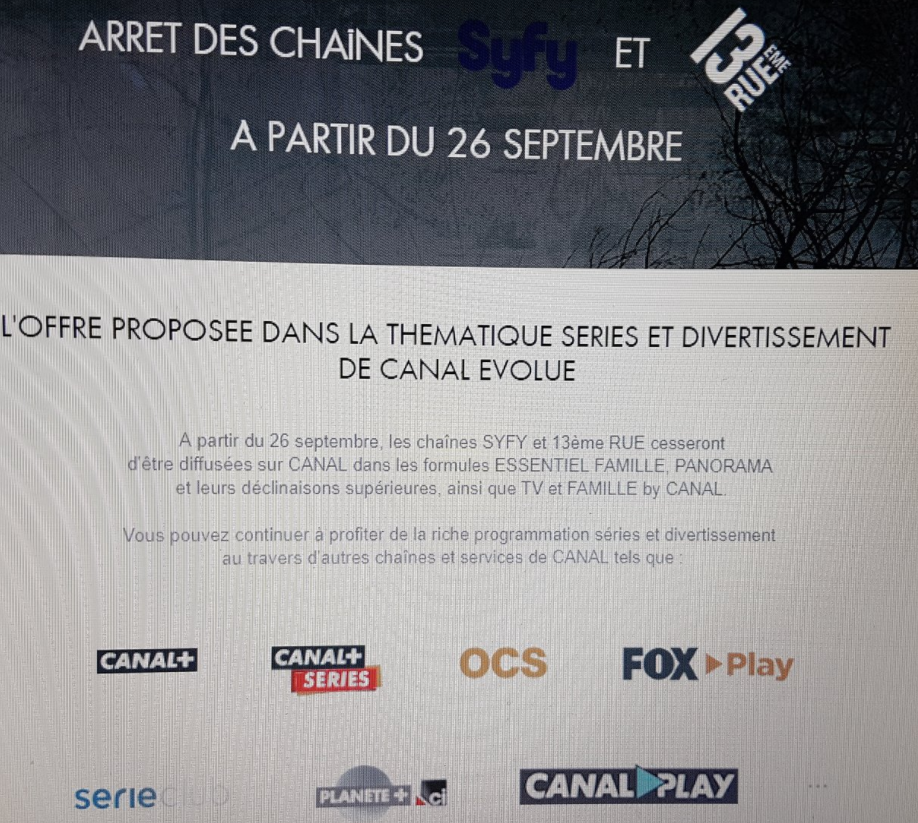 Depuis, les chaînes sont arrivées chez SFR, mais sont toujours diffusées chez Canal, Free et Orange. Mais ce ne sera plus le cas à compter du 26 septembre. En effet, Canal s’exprime pour la première fois à ce sujet et annonce sur son interface TV l’arrêt de 13ème Rue et Syfy à compter du 26 septembre, que ce soit chez Free, Orange et bien sûr Canal.