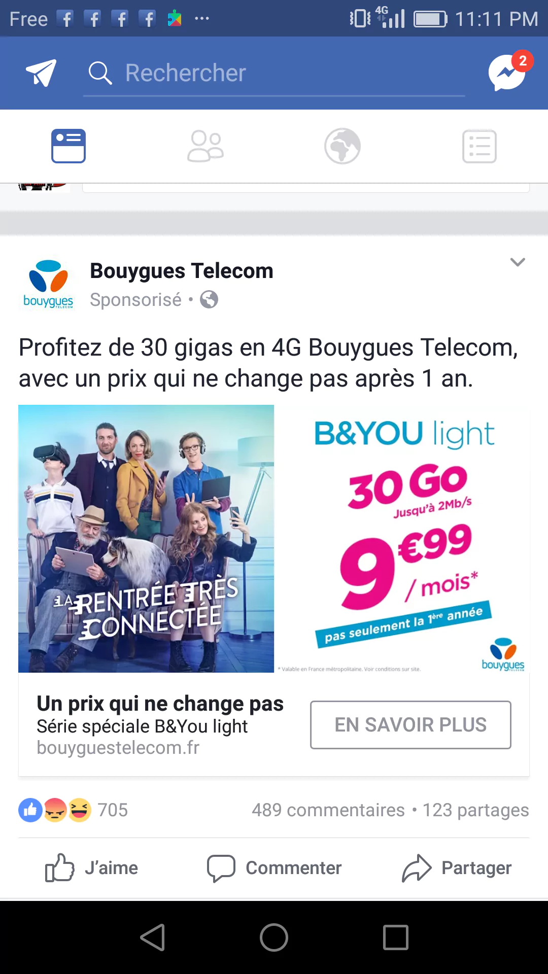 Mais si lors du lancement de ce forfait, Bouygues Télécom ne parlait pas de 4G (voir capture ci-dessus), ce n’est plus le cas maintenant dans ses publicités (voir capture ci-dessous). L’opérateur annonce en effet qu’il s’agit d’un forfait 4G. Même si bien sûr ce forfait fonctionne sur le réseau 3G et 4G de Bouygues, il ne bénéficie en aucun cas des débits idoines puisque limités à 2 Mbits/s. Annoncer qu’il s’agit d’un forfait 4G était jusque là synonyme de très haut débit, ce terme est désormais galvaudé. A quand une box