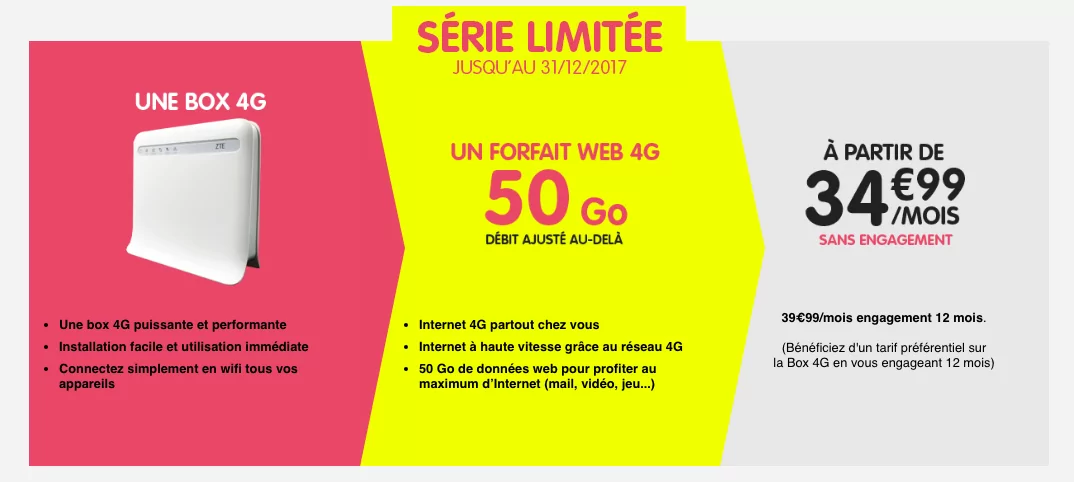Ainsi jusqu’au 31 décembre 2017, le MVNO tend donc la main aux foyers dont la connexion internet est trop lente ou inexistante à condition d’être couvert par un réseau 4G, en commercialisant une box 4G (internet seul) à 34,99 € par mois sans engagement, modem-routeur MF253 de ZTE facturé 99 euros ou 39,99€/mois avec un engagement de 12 mois, le modem ne coutant cette fois qu’un euro symbolique.