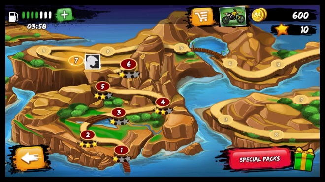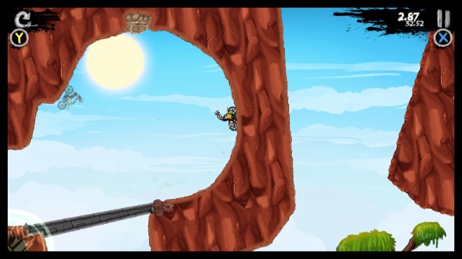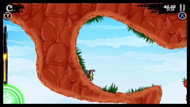Les commandes de « Bike Rivals » sont plutôt basiques. Appuyez sur la gâchette de droite pour accélérer, sur celle de gauche pour freiner, utilisez la direction de gauche ou de droite afin de gérer le poids de votre motard sur sa machine et enfin appuyez sur la touche A ou encore 3 pour utiliser la nitro. Le jeu est jonché d’obstacles plus difficiles à franchir les uns que les autres au fur et à mesure des niveaux. Le joueur peut obtenir une, deux ou trois étoiles par épreuve en fonction de son temps. Faites des wheelies, backflips ou encore frontflips et récoltez des boosts de nitro durant votre progression à utiliser avec parcimonie. Le jeu propose de nombreux niveaux ainsi que des motos et des apparences personnalisables.