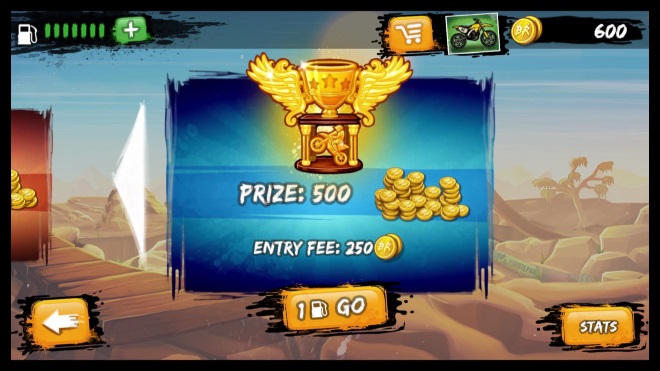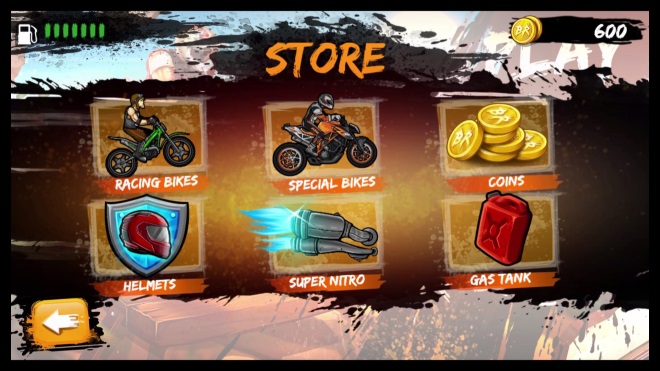 Ces coins peuvent servir à acheter des nouvelles motos, des casques, de la nitro ou encore d’augmenter la capacité de son réservoir. Pour chaque épreuve, un cran du réservoir d’essence est utilisé. Par défaut votre réservoir contient 7 crans et il est extensible avec des « Coins » afin de vous permettre de jouer plus longtemps
