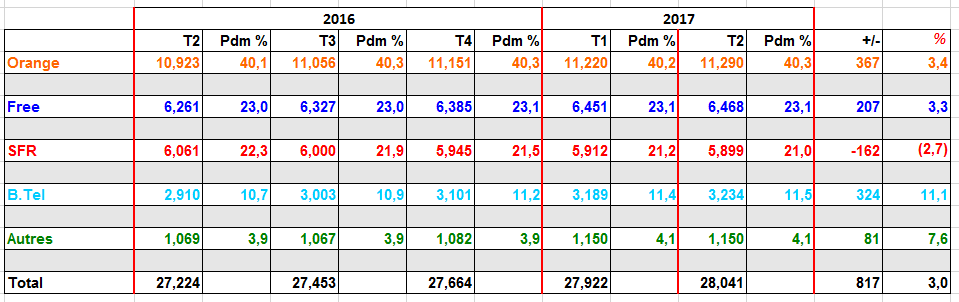 Dans le tableau ci-dessous on peut donc voir l’évolution et la situation actuelle d’Orange, Free, SFR, Bouygues Télécom ainsi que les « petits » opérateurs (regroupés dans « autres ») dans lesquels on trouve par exemple les opérateurs DCOM, les opérateurs professionnels et les opérateurs locaux, les FAI alternatifs. Les chiffres sont exprimés en milliers.