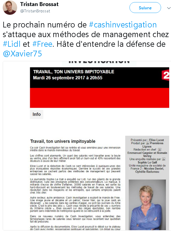 « Travail, ton univers impitoyable », tel sera le titre du Cash Investigation qui sera diffusé à la fin du mois sur France 2. Présenté par Elise Lucet, ce nouveau numéro s’intéressera à « quelques-unes des plus incroyables réussites économiques » qui cachent parfois des méthodes de management « qui peuvent casser les salariés ». Après une enquête sur Lidl, le programme se penchera sur le monde de Free et informe qu’il « révèlera la précarité de ses employés » qui sont « bien souvent sur des sièges éjectables » car « bon nombre partent sans indemnités de l’entreprise quand ils se retrouvent à la porte ». S’en suivra un débat sur le plateau de Cash Investigation avec des responsables politiques et spécialistes.
