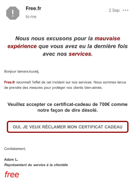 Régulièrement, les abonnés Free (ou d’autre entreprises) reçoivent des mails frauduleux en tout genre. En général, ces messages indésirables sont bourrés de fautes d’orthographe et l’hameçonnage est vite repéré. Un nouvel hameçonnage vient de nous être rapporté, et il a ceci de particulier qu’il justifie d’un incident qui aurait eu lieu chez Free pour offrir un dédommagement. Et pas une petite somme puisque l’abonné bénéficierait d’un chèque cadeau de 700€ !