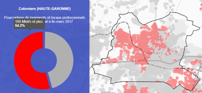 Grâce à la première carte on peut voir que la ville de Colomiers est couverte à 58.6% par le très haut débit.