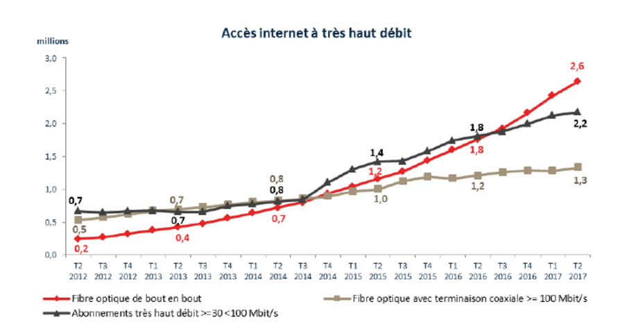 L’Arcep précise par ailleurs qu’ « au total, le nombre d’abonnements à très haut débit représente, au deuxième trimestre 2017, 37% du nombre total de logements éligibles au très haut débit, en croissance de 5 points en un an. En outre, fin juin 2017, plus d’un abonnement internet actif sur cinq est à très haut débit. »