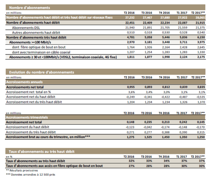 Première constatation du régulateur, le nombre d’abonnements au très haut débit continue à un bon rythme et tend même à s’intensifier : au 30 juin 2017, le nombre d’abonnements très haut débit atteint 6,2 millions, soit une croissance annuelle nette de 1,4 million, contre 1,2 million au deuxième trimestre 2016. Une progression majoritairement portée par l’augmentation du nombre d’abonnements en fibre optique de bout en bout. Ainsi plus de 2,6 millions d’accès sont désormais en fibre optique jusqu’au logement, en croissance de 215 000 en un trimestre. Dans le même temps et ce n’est pas une surprise, le nombre d’abonnements à haut débit (21,9 millions) diminue au rythme d’environ 160 000 par trimestre depuis trois trimestres (-170 000 au deuxième trimestre 2017) en raison du recul du nombre d’abonnements DSL.
