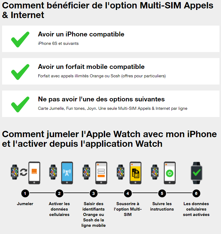Un abonné Orange s’est rendu dans une boutique et a pu obtenir les informations suivantes qu’il a partagé avec nous. Pour les clients ayant déjà l’option Multi-SIM incluse dans leur forfait (Play et Jet), il n’y aura pas de surcoût, mais l’usage sera limité à la data. Si l’on souhaite pouvoir utiliser en toute autonomie la montre connectée et donc passer ou recevoir des appels et envoyer des SMS, il faudra souscrire l’option Multi-SIM spécifique à 5 euros/mois.