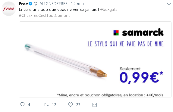 C’est ainsi qu’une nouvelle fausse publicité « que vous ne verrez jamais chez Free » vient d’être publiée. Cette fois-ci, avec un stylo dont l’encre n’est pas comprise et qu’il faut louer en sus à 4€/mois.