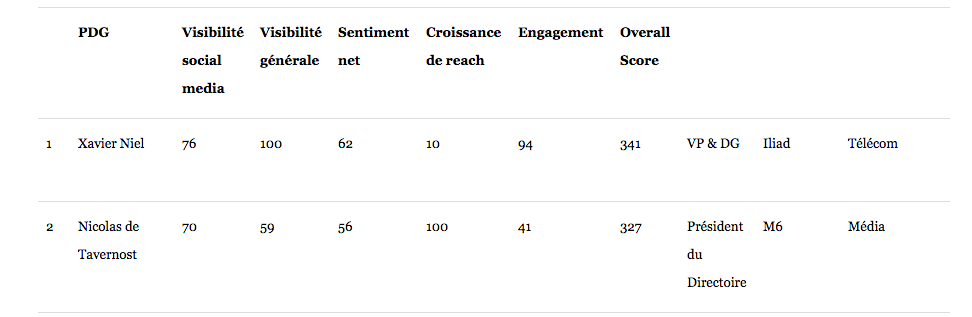 En ce qui concerne la visibilité "social media", les mesures ont été effectuées sur les chaînes Twitter et Facebook. S’agissant de la "visibilité générale", celle-ci mesure combien de conversations chaque PDG a généré autour de lui en dehors de sa société et dans quelle mesure il est cité sur les sites non sociaux comme sur les blogs, forums et les sites d’actualité.