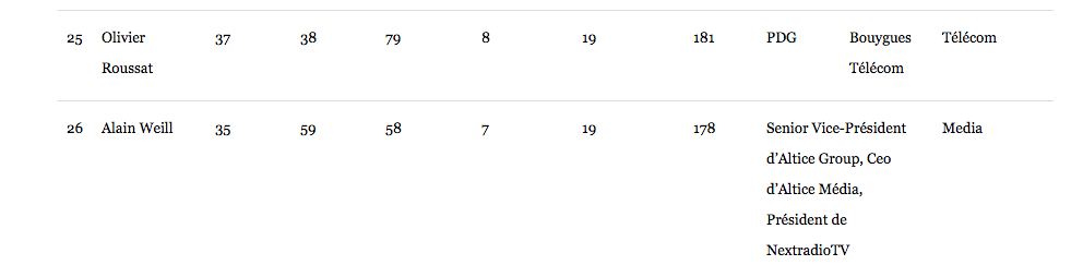 « Sous les feux de l’actualité estivale avec le lancement du plus grand incubateur de start-up au monde, Station F, Xavier Niel est au pinacle », précise Forbes pour justifier son choix. Le fondateur d’Iliad devance en haut du classement Nicolas de Tavernost, PDG de M6 qui a oeuvré pour le rachat du pôle radio de RTL Group par la chaîne. Côté télécoms, Stéphane Richard, patron de l’opérateur historique apparaît au septième rang, Martin Bouygues se classe 22ème devançant, Olivier Roussat, PDG de Bouygues Telecom et Alain Weil, directeur général des activités Media d’Altice et directeur général de SFR Media (26ème). Patrick Drahi ne figure quant à lui pas dans le classement.